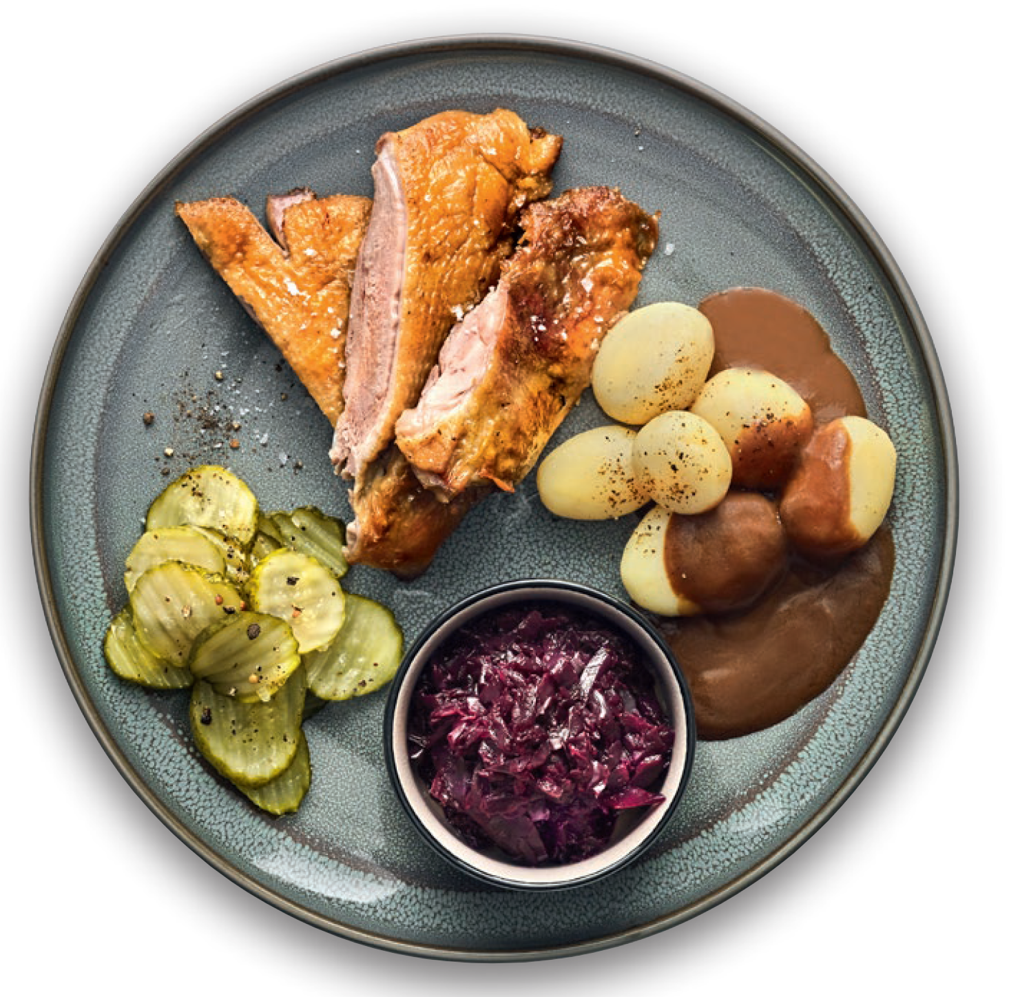 And med hvide og brune kartofler, rødkål og sovs, franske kartofler